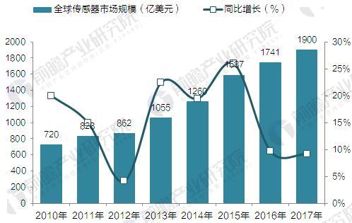 图表1:2010-2017年全球传感器市场规模增长情况(单位:亿美元,%)