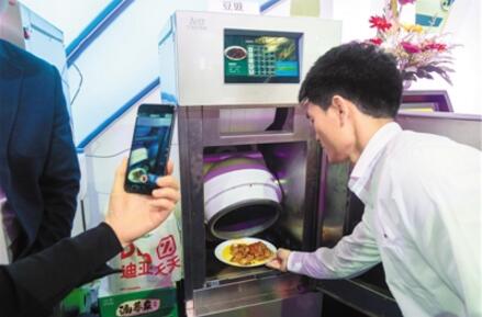 近日,一款商用智能自动炒菜机出现在上交会现场,现场工作人员使用该机器炒制了多款美食,吸引了观众品尝。 王 冈摄(人民图片)