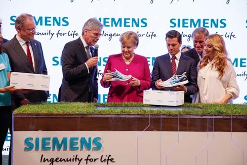 西门子股份公司总裁兼首席执行官凯飒(Joe Kaeser)向德国总理默克尔和墨西哥总统培尼亚赠送运用西门子技术制造的运动鞋。