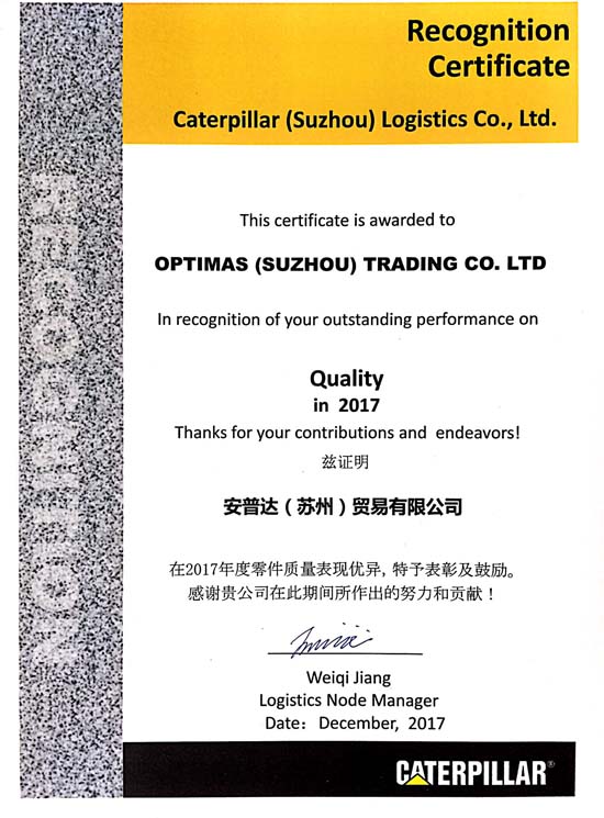 安普达(中国苏州)公司以其争创“零缺陷文化”的不懈努力而受到卡特彼勒公司的表彰 – 获颁该公司2017年最佳质量奖。