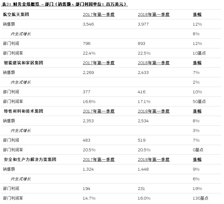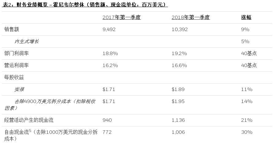 霍尼韦尔第一季度实报销售额增长9%,内生式销售额增长5%。两者之间的差异主要来自于汇率影响。有关第一季度的具体财务数据请参阅下方的表2和表3。