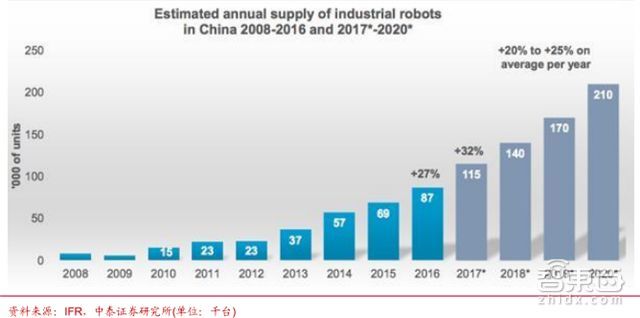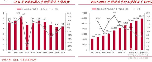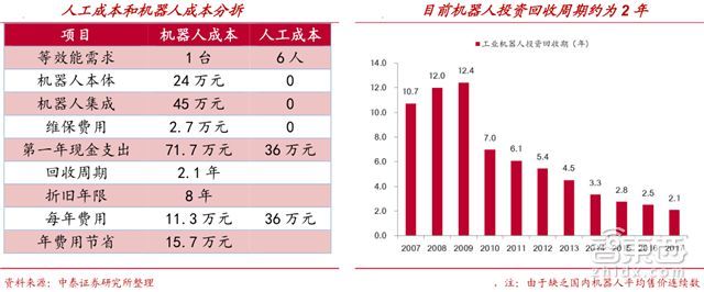 中泰证券预计未来五年,将是工业机器人持续高速发展的黄金时代,这背后的逻辑在于人工成本的持续上涨,以及机器人带来的产品质量稳定性。