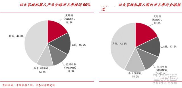 在世界工业机器人业界中,以瑞士的 ABB、德国的库卡、日本的发那科和安川电机最为著名,并称工业机器人四大家族,目前在全球范围内市场占有率达到60%。
