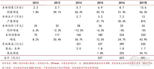 根据GGII数据,预计2017年中国机器人销量达13.6万台,同比增长 56%(国家统计局数据:国内产量13万台,同比增长81%);对应本体及集成市场约855亿元,同比增长37%。2018年前2个月,产量近1.9万台,较2017年前两月同比增长37%。