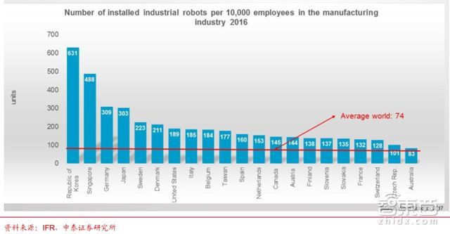 先来看我国机器人密度:据IFR统计,世界各地的生产自动化正在加速,2017年全球工业机器人密度达到74(每10,000名员工拥有74个机器人单位),我国机器人密度全球排名第23位,仍有很大空间。