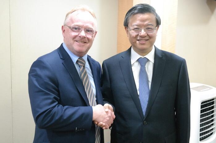 挪威贸工渔业部渔业大臣佩尔·桑贝格(Per Sandberg)先生(左)与中国海关总署署长倪岳峰(右)亲切会晤(照片版权属于:Halvard Wensel)