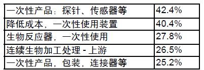 今天生物制造行业对技术革新的投入将决定未来几年生物加工处理发展的战略方向。在我们的研究中,我们认为最主要的发展趋势是生物制药制造商希望他们的供应商将重点放在新产品的开发上。在表1中显示了“上游”生物加工领域中排名前五的5个领域。其中包括一次性使用装置以及连续生物加工处理等创新技术。许多其他的上游生物加工领域也提及了一次性使用装置。