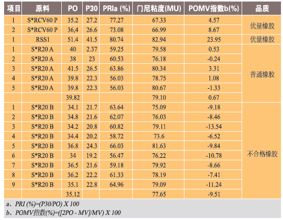 从数百条数据和对原材料供应商的多年调查中,我们发现POMV指数是天然橡胶质量的指标(附表)。看来,POMV值越大,橡胶的质量越好。