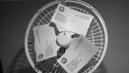 图2:使用卷帘快门的模糊的风扇图像(上图)和使用全局快门的非模糊版本(下图)