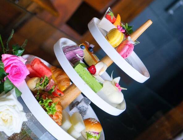 为搭配主题花艺课堂,此次下午茶提供包括白绿色系的茉莉花慕斯、玫瑰香槟冻;粉色系的树莓蛋糕及草莓夹心蛋糕;紫色系的熏衣草慕斯、蓝莓蛋糕;黄色系的桂花奶冻及芒果慕斯在内的多种精美主题甜品,搭配英国皇家御用品牌TWININGS川宁茶。更有传统英式下午茶礼仪讲解,让来宾们深入了解下午茶历史渊源。