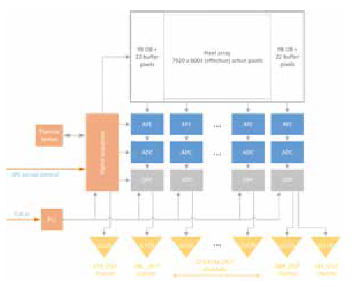 CMV50000的像素阵列为7920×6004,它采用具有真正CDS的4.6μm 8T流水线式全局快门像素结构。该传感器设计在减小像元尺寸的同时保证性能接近甚至更好。它配备一个12位ADC,具有非常低的噪声水平(8.8e)和高线性满阱电荷(14500e),动态范围可达64dB。低暗电流(60℃ 时为66e/s)与片上黑电平校准相结合,令该传感器即使未经冷却,也可以实现数秒的长曝光。