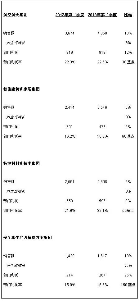 霍尼韦尔(纽约证券交易所代码: HON)日前公布了2018年第二季度业绩,并上调了全年销售额、部门利润率、每股收益1和自由现金流4指导。