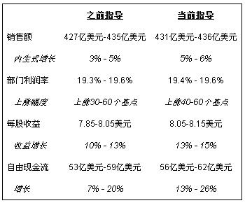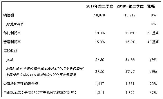 “基于我们第二季度的强劲业绩和对未来前景的信心,我们将上调2018年指导。我们预计全年内生式销售额增长为5%到6%之间,部门利润率增长为40到60个基点之间,每股收益为1为8.05美元到8.15美元之间,自由现金流4为56亿美元到62亿美元之间,”杜瑞哲说。