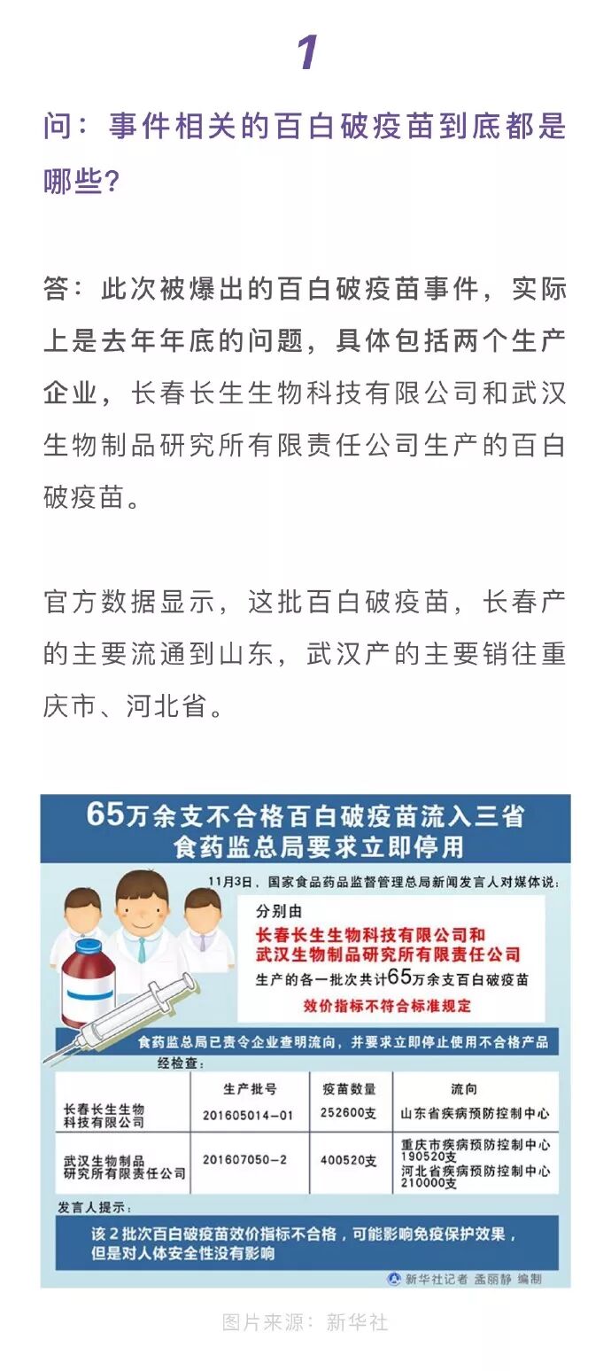 2017年11月,国家食品药品监督管理总局新闻发言人3日对媒体说,分别由长春长生生物科技有限公司和武汉生物制品研究所有限责任公司生产的各一批次共计65万余支百白破疫苗效价指标不符合标准规定,食药监总局已责令企业查明流向,并要求立即停止使用不合格产品。据介绍,上述不合格疫苗对人体安全性没有影响。