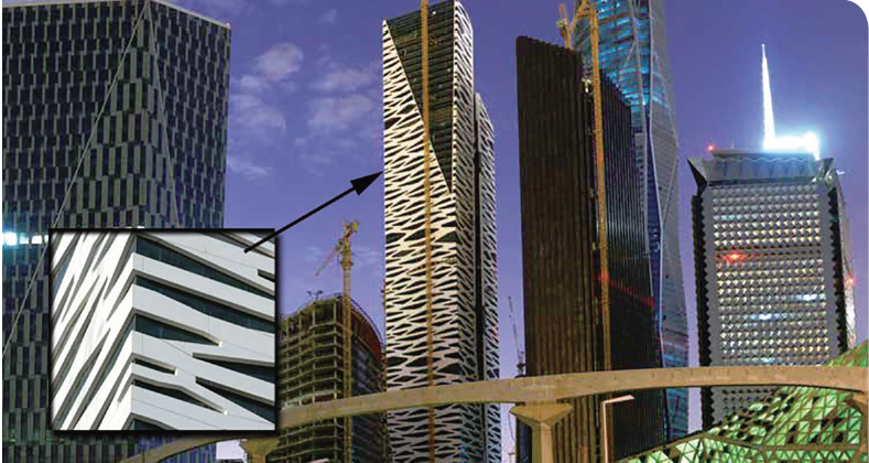 虽然FRP可用于建筑应用中制作模具,但它也可作为世界上最令人惊叹的建筑外观的主要材料。在沙特阿拉伯利雅得国王阿卜杜拉金融区第二高的高塔——卡夫德世界贸易中心(KAFD)引人注目的外立面上,就使用了FRP复合材料。