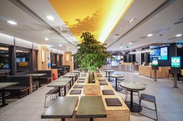 麦当劳奥威东路餐厅位于雄安地标的雄安市民服务中心,于2018年6月正式营业。餐厅占地面积约240平方米,可容纳近90人用餐。餐厅采用了麦当劳最新的工业风设计,简约摩登。店内的阳光黄色展现了能量与活力;木色与金属材质混搭,加上品牌元素的抽象线条,营造现代舒适的用餐环境。餐厅的三面玻璃幕墙充分利用了自然采光,让顾客随时欣赏室外庭院的美景。餐厅配备全套“未来餐厅”元素,包括自助点餐、双点式柜台、电子餐牌及送餐到桌服务等。餐厅还设有McCafe专区,为顾客提供上佳的咖啡体验。