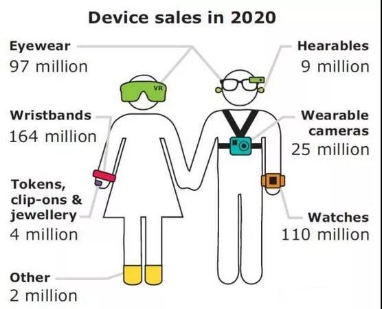 可穿戴设备的迅猛发展离不开传感器的作用,不同的传感器为设备提供大量丰富的数据,将所需要的信息指标显示出来。可穿戴设备随着它集成的传感器的发展而发展,可穿戴设备市场增长的关键之一就是传感器。不同的可穿戴产品面向的用户不同,使用目的不同,内置的传感器也不尽相同。可穿戴设备中的传感器根据功能可以分为:运动型传感器、生物型传感器、环境传感器等。