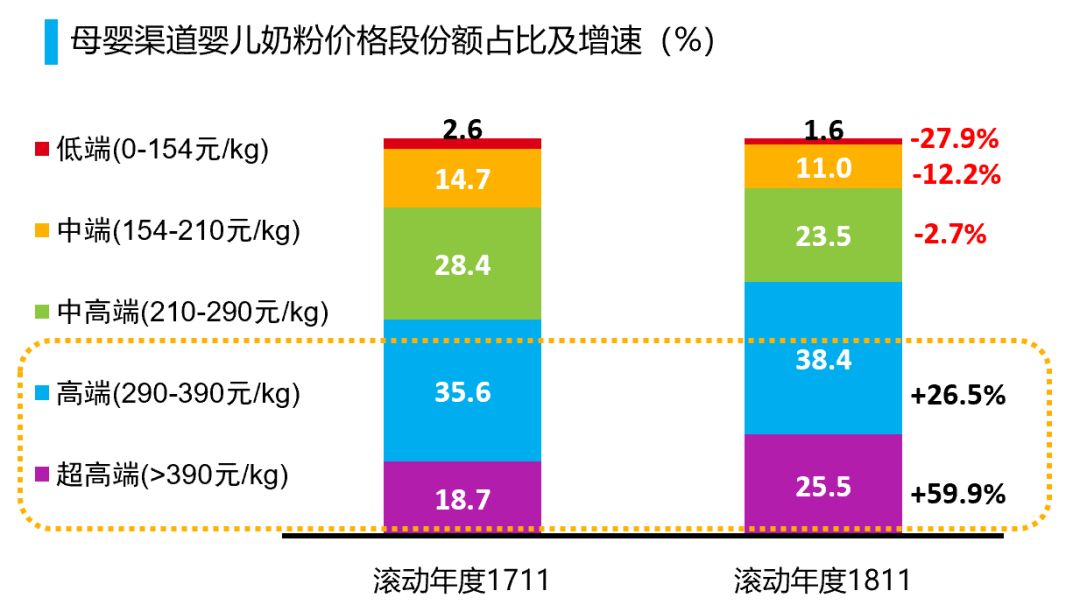 尼尔森研究显示,婴幼儿奶粉品类中,超高端奶粉增速达到了60%,高端化趋势显著。尿布品类发展也是如此,价格在160元以上,即高于市场价格1.6倍的高端婴儿尿布增速度达到30%。