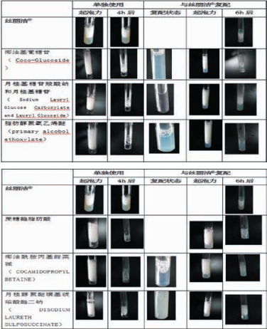 取同一浓度、同一体积的预配表面活性剂溶液,在 添加丝丽洁®前后,以同一震荡力度,震荡2分钟,观察 震荡后以及震荡后静置4个小时、6个小时的泡沬颗粒的 大小以及泡沫高度。结果显示,复配丝丽洁⑫的产品泡 沫更加细腻、丰厚、绵实,持泡力久,洗后肤感丝滑丰 润。张向阳认为,复配这种可降解的天然蛋白不仅降低环境负担,增加终产品持续的保湿爽滑感,同时还可以 降低表活使用量,减少对皮肤的刺激性影响。