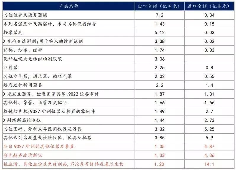 让我们再来看看中美医疗相关贸易情况的分析。 根据财新智库莫尼塔研究5月12日的最新行业报告,海关数据显示,2017年我国医药产品出口额共计543.52亿美元,出口第一大国为美国,共计98.18亿美元,占比18%。医药类产品进口额558.77亿美元,同比增长16.34%,进口医药产品最多的为西成药,进口额171.57亿美元,增幅21.66%;医院诊断与治疗设备进口146.31亿美元,同比增长9.60%。 我国医药产品出口及美国占比(数据来源:中国海关,莫尼塔研究) 在医疗器械方面,2017年我国医疗器械出口总额达217.03亿美元,同比上涨5.84%,对美出口额为51.05亿美元,主要以中低端医疗器械为主,以按摩保健器具、医用耗材敷料为主的前十大出口产品占据我医疗器械出口总额的44.5%。医疗器械进口方面,以高端产品为主,包括核磁共振、CT等等。 主要医疗器械产品中美进出口额对比(数据来源:中国海关,莫尼塔研究) 中国出口美国的医疗器械 TOP10(数据来源:中国海关,莫尼塔研究) 加征关税,高端医疗器械和IVD产业将受影响 纵观关税清单,其中将被征收25%关税的诊断试剂引人注目。目前我国体外诊断试剂生产企业约300~400家,其中规模以上企业近200家,但年销售收入过亿元的企业仅约20家,企业普遍规模小、品种少。2017年,我国体外诊断市场规模517亿元,其中体外诊断试剂市场规模400亿元,远超于体外诊断设备规模的117亿元。 根据医趋势的分析,加收关税政策对我国本土的体外诊断行业来说是一个利好消息。当进口品牌的价格优势进一步被遏制,销往终端渠道的难度加大时,对于进口品牌来说,要么涨价要么和国产企业合作生产,通过品牌本土化的办法抢占中国市场,在我国市场份额会受到极大的影响。这就给了大批优秀的国产包括合资IVD企业一个机会,在进口品牌本土化的过程中,通过和他们合作,引进先进的国外技术和资源,大大加快国产企业前进的步伐。 传递到医疗采购过程中,对进口厂家和代理商来说,却是如履薄冰。因为这涉及到让他们消化最高达25%的税率费用,最简单的办法就是涨价,将费用转嫁到消费者身上。 在出口方面,我国医疗器械主要以低端设备、一次性耗材出口为主,美国对内征税主要涉及高端产品,因此对国内器械出口影响不大。 在进口方面,主要以高端医疗器械产品为主,国内部分领先企业在少数高端器械领域已经开始进口替代,对这部分公司来说,将带来一定的利好。 目前国产医疗器械仅在生化诊断、心脏支架、骨科创伤、监护仪等少数细分领域实现了进口替代,大多数领域仍然由进口企业占据主导地位,如化学发光、血液分析、内窥镜、超声、骨科关节、起搏器等领域进口占比都超过50%。对于这些未能实现国产化的领域,在相关政策的引导和扶植下,将进一步刺激和推动进口替代的加速实现。 同时,2018年中国医疗器械市场规模约为5304 亿元,同比增长19.86%,预计到2020年将超过7000亿人民币,未来10年我国医疗器械行业复合增速超过10%,中国医疗器械发展黄金十年将至。如此大的蛋糕,国外巨头决不会轻易放弃中国市场,势必将推动进口品牌的本地化。