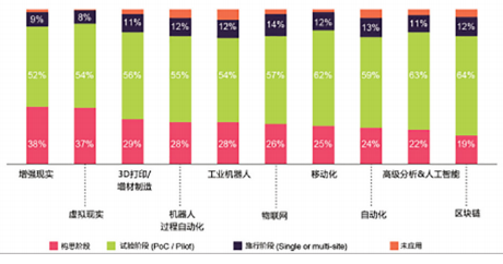 人工智能和高级分析在供应链的数字化部署中发挥着重要作用,并将带来可观的回报。如图1所示,在所调查的企业中有63%该技术的应用水平处于测试阶段,处于测试阶段的比例仅次于数据区块链技术。这项技术尤其受到制造业和消费品行业的追捧,其应用场合包括:需求/供应计划、设备维护预测等。思科(Cisco)公司旗下包合300多个产品系列,拥有高度多样化的全球供应链,他们将人工智能技术应用于地理信息系统中,以优化其客户交付服务的运营方式,例如设立辐射全球的客户服务站点。通过站点所获取的数据,可以实现对需求/供应的分析预测,从而可以为客户提供更优质的技术服务,并且能更好地分配和控制备件库存量。