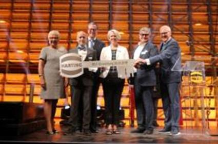 现场激动的观众对这些演员以及德国西北爱乐乐团的小号二人组报以热烈的掌声。Anne Heinemann和Thomas Meise以大约10米长的音乐小号间奏让客人们感受到惊喜。Achim Meyer还向员工Tanja Brinkmann、Ullrich Brinkmeier、SvenDüker致谢。EnricoGlaße、Jochen Richter、Thomas Richter、Antje Senst和Kristin Thomsmeyer由于在数年的规划和建设中表现非凡而获得献花。洪玛嘉(Margrit Harting)向HARTING Logistics董事总经理Achim Meyer授予公司金点奖荣誉,以此表彰其所作出的巨大贡献。他曾经管理过德国及周边国家约100个物流中心。2017年5月,欧洲配送中心(EDC)破土动工。