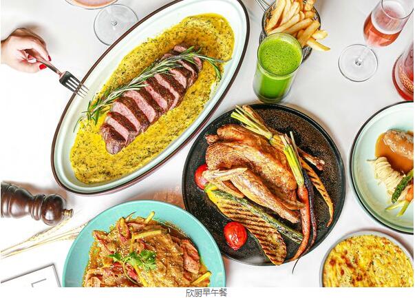 欣厨早午餐为半自助形式。丰富前菜,中西美馔,菜式从传统到创新,从温和到辛辣,可供宾客自由选取搭配。在惬意慵懒的周末,用高空美景与丰盛美食一起创造关于早午餐的精彩时刻。主厨推出五款精致菜肴供客人选择。其中澳洲西冷牛排配薯条,选取澳大利亚谷饲牛肉,佐以由21种不同配料匠心调制的法式风味酱汁“Cafe de Paris”;另一道菜:英式白汁海鲜派将三文鱼,扇贝,虾,龙利鱼,鱿鱼,青口贝六种海鲜完美融合;还有意大利传统烘焙,外酥内嫩,混合柠檬酸香的柠檬烤鸡,让人胃口大开;泰式黄咖喱蟹,采用新鲜草本香料,蟹肉鲜甜,咖喱浓郁,带来心满意足的味蕾享受;鲍汁伊面扣海参,精选南美海参,口感爽滑,佐以鲍汁和甘美的伊面,温润滋补,营养丰富。