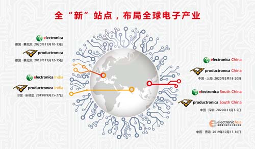 electronica是世界知名的电子元器件和组件展览会。productronica是世界知名的电子生产设备展览会。两展分别于单双年在德国慕尼黑轮流举办。慕尼黑博览集团全球电子展网络包含了全球的一系列电子展览会,包括electronica、productronica、electronicIndia、electronicAsia、electronica China、productronica China等。这些展会基于慕尼黑本土展览会的经验,展示了契合于当地市场需求的内容。