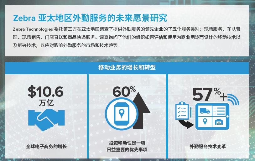 作为致力于通过其解决方案及合作伙伴助力企业获得性能优势的边缘式创新者,斑马技术公司(纳斯达克股票代码:ZBRA)今日公布亚太地区《外勤服务的未来愿景研究》结果。调研结果显示,亚太地区60%的受访企业将投资移动技术的优先级不断提高,并且认为移动技术对于业务提升十分重要。