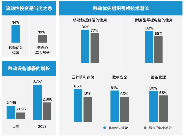 调研结果表明,亚太地区44%的企业将投资移动技术视为重中之重。企业将针对颠覆性技术和企业级移动设备进行投入,以提高其外勤服务一线员工的生产力以及提升客户的满意度。这些投入涉及车队管理、现场服务、交货证明,以及门店直送的工作流等多个方面。此外,亚太地区58%的企业正在将移动技术的采用扩展至其整个企业范围,至2023年这一比例将高达97%。