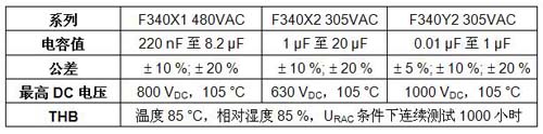 F340X1额定电压为480 VAC,电容值0.22 µF至8.2 µF,最高工作电压达530 VAC,确保符合三相电源电压变化的要求。F340X2额定电压305 VAC,电容值1 µF至20 µF,10 kHz条件下纹波电流最高可达18 A。F340Y2符合AEC-Q200认证标准,额定电压305 VAC,电容值10 nF至1 µF。