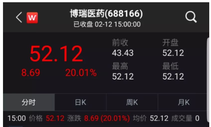 2月12日,博瑞医药开盘便“一”字涨停,截至收盘,其股价为52.12元/股,创出上市以来新高。