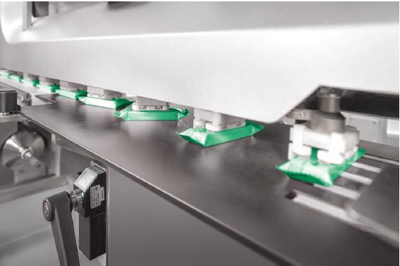 Leclerc 生产线中的 Sigpack HRM枕式包装机会以每分钟 720 个产品的速度包装。枕式包装机配备了智能的 Sigpack FIT 产品进料系统。由于采用了磁悬浮电机技术,因此只需按一下按钮,就可以非接触式、安全地送入产品,并且过程流畅,同时支持快速更改包装规格。Syntegon 拥有获得专利的、全自动高性能卷膜拼接器可实现无缝拼接,从而减少了生产过程中产生的浪费。