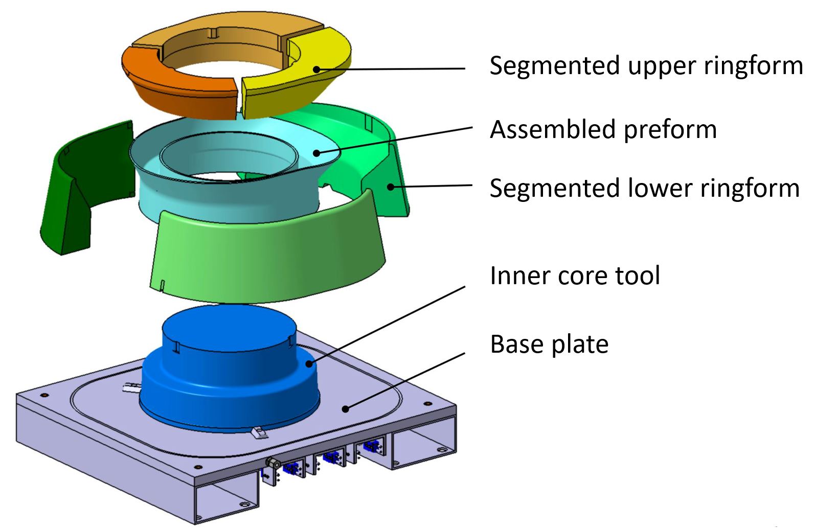 针对四个预成型件,工程团队研发了各自对应的特殊工装,然后将所有预成型件和环形扣板一起组装成最终使用的固化工具。最终完整的固化工具均由铝合金制成,包括固定在灰色底板上的蓝色工装、多部分拼接而成的绿色环形工装以及橙色和黄色的顶部环形工装。多部份拼接工装的设计目的,是为了防止固化冷却过程中工装冷却而产生的收缩力。