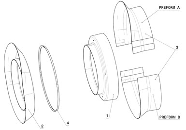 针对树脂灌注,工程团队研发了如下图所示的四个预成型件。其中,3号预成型件包括A和B两个部分;4号预成型件就是无增强聚合物扣板,用于确保T型区域的连接。