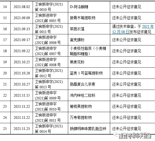 2021年卫健委共公开受理了25个新食品原料申请,包含国产产品14个和进口产品11个。各产品的技术审查状态及部分产品的审查结果如下表。