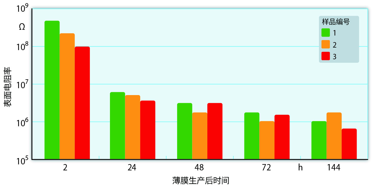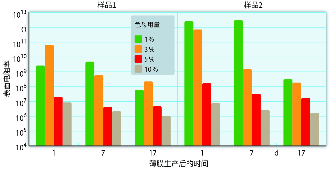 HPAS母料通常按2%至3%的比例添加。一般情况下,表面电阻率达10 x 107至10 x 108Ω。进一步添加母料可产生高达10 x 106Ω的值。然而,薄膜表面添加剂高度饱和会导致浑浊、更低的半透明度、更差的触感(产生油腻感)。