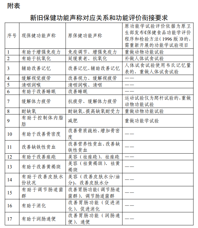市场监管总局遵照“科学合理、有效衔接、平稳过渡、规范调整”的原则,分别于2019年3月、2020年11月、2022年1月三次面向社会公开征求意见,对《目录》及配套文件进行修改完善。《目录》将原来的27种保健功能调整为24种,删除了“改善生长发育”“促进泌乳”“改善皮肤油分”等3种共识程度不高、健康需求不明晰的保健功能,将功能评价方法由强制方法调整为推荐方法,落实企业研发评价主体责任,充分发挥社会资源科研优势。
