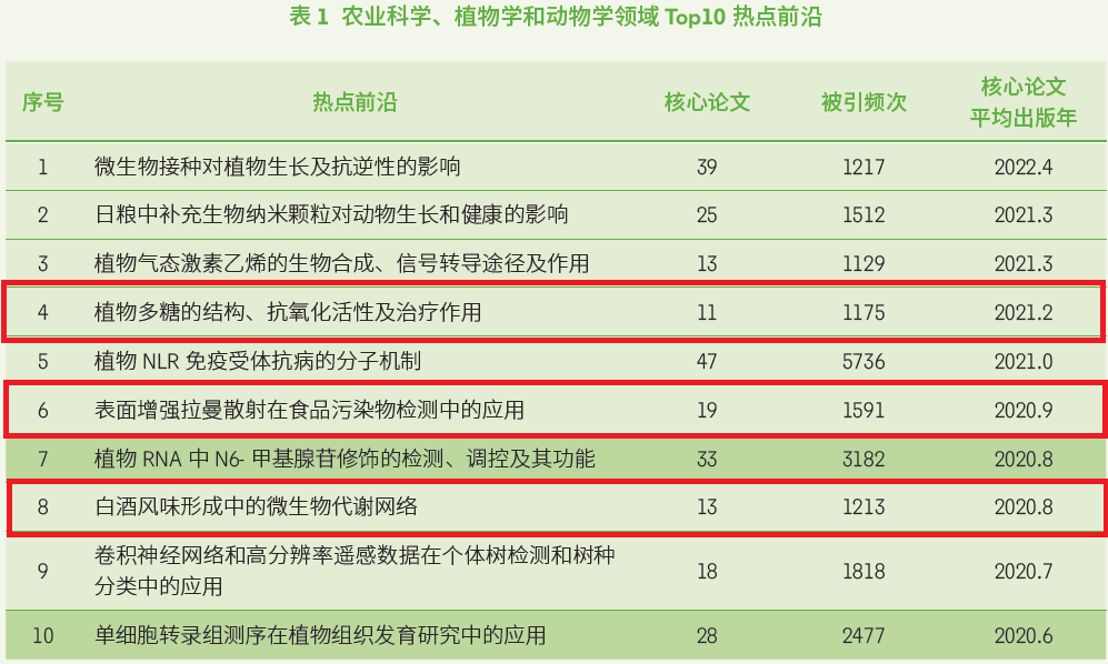 农业科学、植物学和动物学领域居于前10 的热点前沿主要分布在植物基因调控、动物营养、食品科学与工程及林木生态监测等4 个子领域(表1)。食品科学与工程子领域的热点前沿有3 个,也聚焦三个研究方向:食品污染检测、食品营养物质和食品发酵工程,主要关注了表面增强拉曼散射检测法、植物多糖及白酒风味形成的微生物代谢网络。
