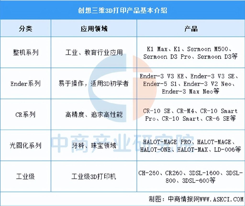 目前,创想三维3D打印相关产品分为整机系列、Ender系列、CR系列、光固化系列、工业级,具体如图所示:
