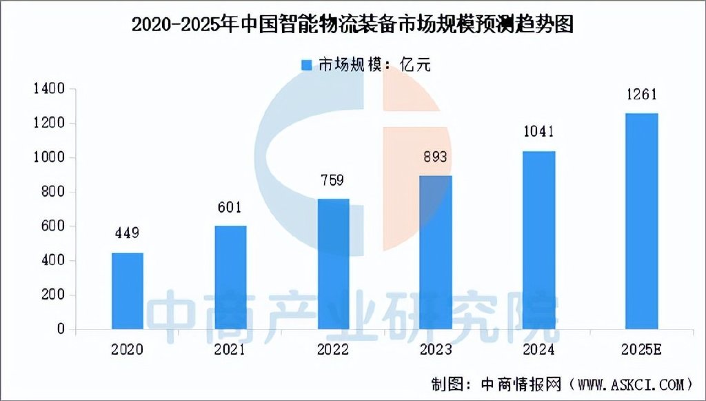 智能物流装备指用于产品运输和储存的自动化装备和系统。中商产业研究院发布的《2025-2030年中国智能物流装备行业研究报告》显示,在供应链自动化需求增长、物联网和人工智能技术进步的推动下,中国智能物流装备的市场规模从2020年的449亿元增至2024年的1041亿元,复合年增长率为23.4%。中商产业研究院分析师预测,2025年中国智能物流装备市场规模将达到1261亿元。