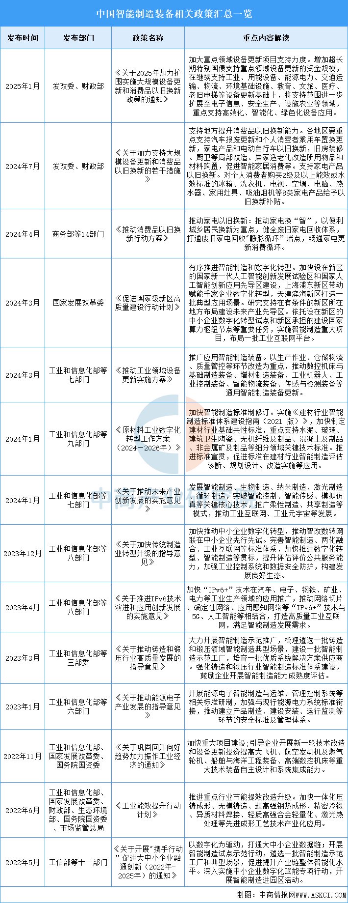 加快发展智能制造,是培育我国经济增长新动能的必由之路,是抢占未来经济和科技发展制高点的战略选择,对于推动我国制造业供给侧结构性改革,打造我国制造业竞争新优势,实现制造强国具有重要战略意义。为此,国家颁布了一系列有利于智能制造装备行业的产业政策,以促进行业的健康发展。具体政策内容如下图所示: