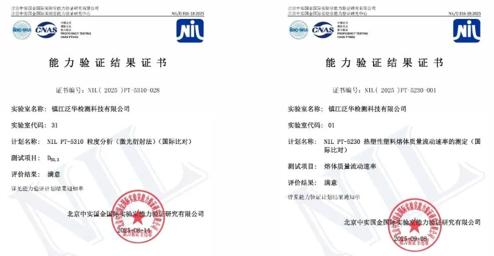 近日,镇江泛华检测科技有限公司(以下简称"泛华检测")近日连续通过两项由北京中实国金国际实验室能力验证研究有限公司实施的能力验证计划,分别获得"粒度分析(激光衍射法)"(NIL(2025)PT-5310-028)和"热塑性塑料熔体质量流动速率的测定"(NIL PT-5230)"满意"结果证书,再次彰显其在材料检测领域的专业技术实力与行业领先地位。