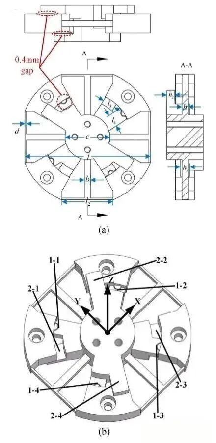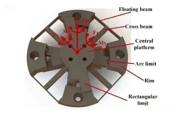研究人员采用序列二次规划(SQP)算法对传感器弹性体简化静态模型进行优化设计,以最大化传感器灵敏度,同时将与过载保护结构相关的尺寸约束纳入优化过程。该过载保护结构通过圆弧限位限制力(Fx、Fy)及力矩(Mz),通过矩形限位结构限制力(Fz)及力矩(Mx、My)。