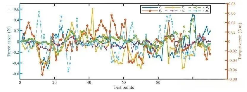 图5 六维力/力矩传感器精度测试数据误差曲线