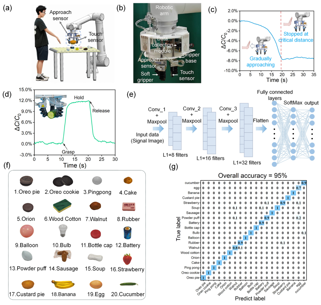 图4. 机器人传感器在与人体碰撞预警及人工智能辅助物体识别中的应用。(a) 示意图,显示集成机器人传感器的可编程机器人臂系统,用于人机交互(HRI)。(b) 展示传感器集成在夹持器指端(用于物体操作监测)和夹持器底座(用于危险碰撞预警)上的情况。(c) 当人手逐渐接近机器人臂并在临界距离1厘米处停止时,传感器的响应信号。(d) 软夹持器在抓取、夹持及释放黄瓜过程中的传感器响应行为。(e)用于物体识别的卷积神经网络(CNN)模型结构示意图。(f) 用于测试的20个不同日常物体的数字图片。(g) 显示20个物体识别准确率的混淆矩阵。