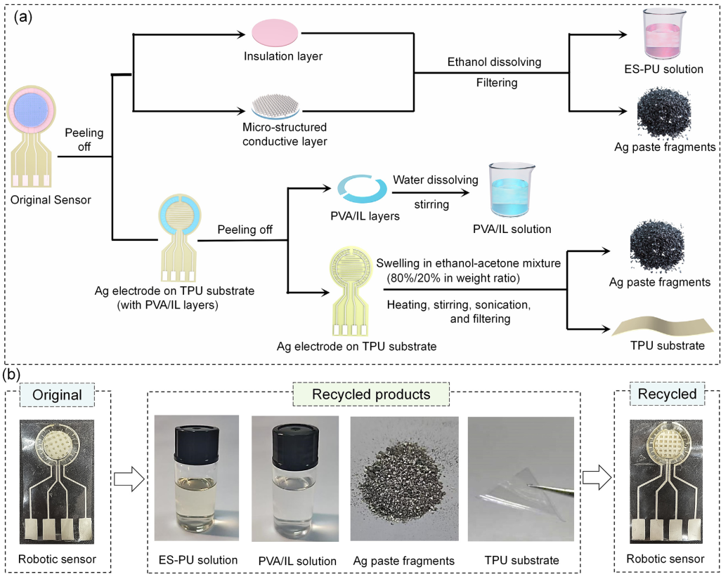 图6. 机器人传感器的回收过程。(a) 示意图展示了基于环保方法的机器人传感器的完整回收过程。(b) 数字图片展示了来自传感器的回收产品,包括ES-PU乙醇溶液、PVA/IL水溶液、银浆碎片和TPU基材。这些回收产品可以再利用于重构新一批机器人传感器。