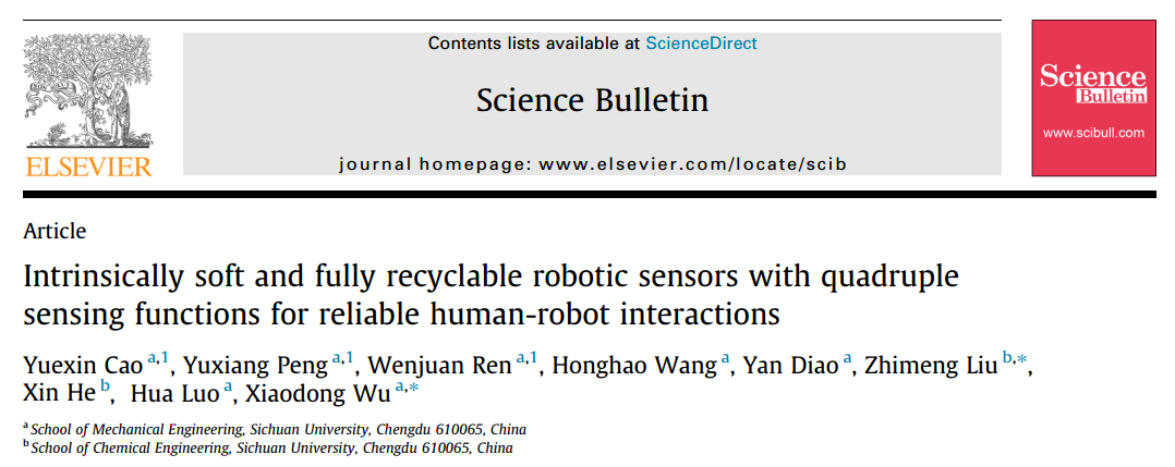 四川大学Xiaodong Wu团队,在《Science Bulletin》上发布了一篇题为“Intrinsically soft and fully recyclable robotic sensors with quadruple sensing functions for reliable human-robot interactions”的论文。论文内容如下: