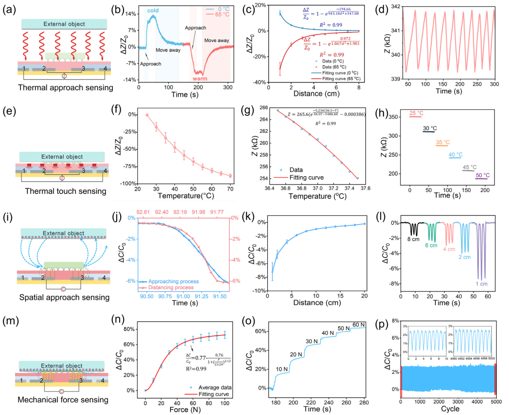 图3. 机器人传感器的感知机制及性能特征。(a) 示意图展示了基于热辐射效应的热感知机制。 (b, c) 传感器对接近冷物体(0 °C)和热物体(65 °C)的响应行为及标定曲线。 (d) 传感器对从远处逐渐接近并移开温暖手掌(距离传感器1厘米)的响应行为。 (e) 示意图展示了基于热传导效应的热触觉感知机制。 (f) 传感器与不同温度物体接触时的标定曲线。 (g) 传感器在热触觉感知中的最低温度检测分辨率。 (h) 传感器对不同稳定环境温度的响应信号。 (i) 示意图展示了基于电场耦合效应的空间接近感知机制。 (j) 传感器在手逐渐接近后又移开的响应行为。 (k) 传感器的空间接近感知标定曲线。 (l) 传感器在不同距离下手部反复接近时的信号变化。 (m) 示意图展示了基于电容参数调制的机械力感知机制。 (n) 传感器的机械力感知标定曲线。 (o) 传感器对不同大小稳定机械力的响应行为。 (p) 传感器在5000次加载-卸载测试中的重复性和可靠性。