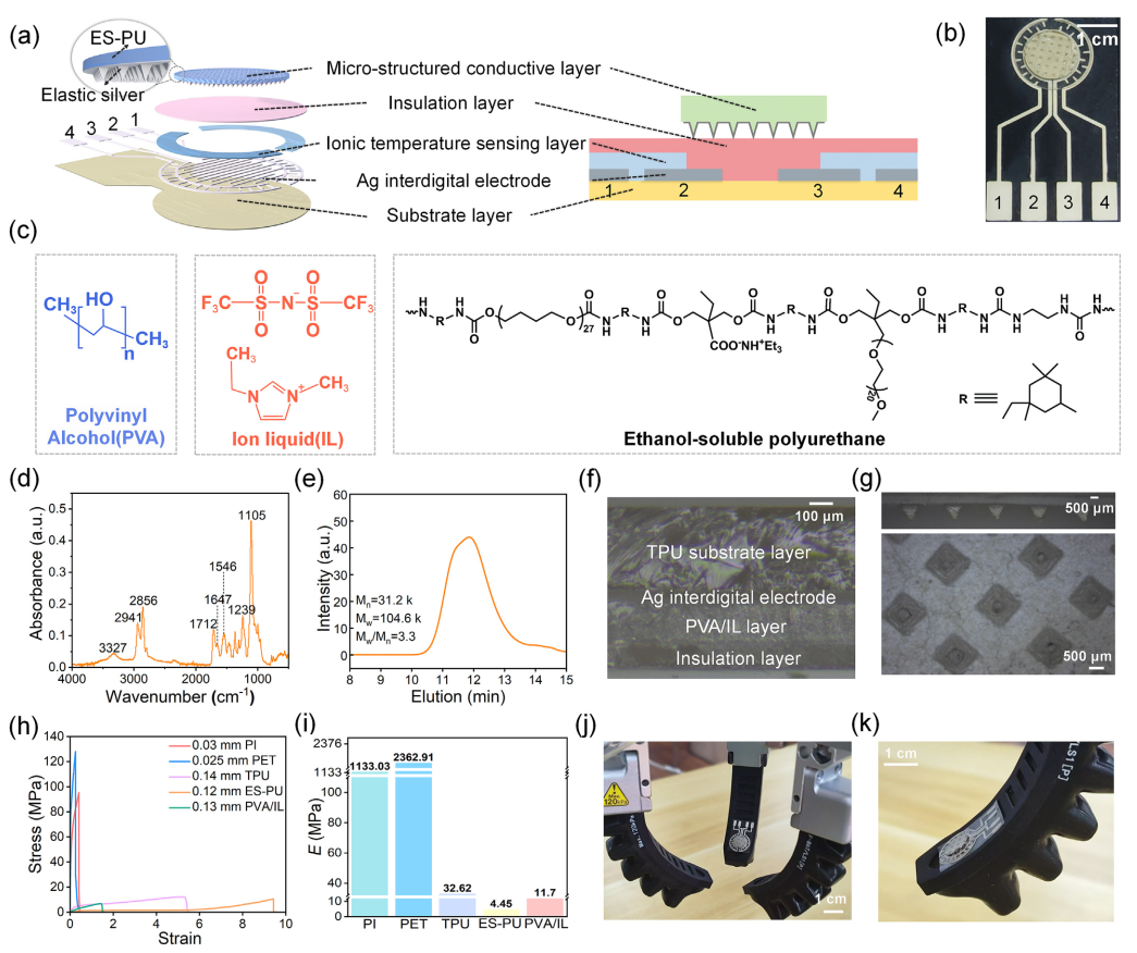 图2. 软体机器人传感器的制备与表征。(a) 示意图,展示软体机器人传感器的三维结构布局及其二维截面视图。(b) 软体机器人传感器的实物照片。(c) 软体机器人传感器中关键组分(即聚乙烯醇PVA、离子液体IL和热塑性聚氨酯ES-PU)的分子组成与结构。(d, e) 自合成的ES-PU材料的傅里叶变换红外光谱(FTIR)及凝胶渗透色谱(GPC)谱图。(f) 光学显微镜图像,显示软体机器人传感器的横截面形貌。(g) 光学显微镜图像,展示微结构导电层顶部工程化金字塔图案。(h, i) TPU层、ES-PU层及PVA/IL层的应力-应变曲线与杨氏模量,采用常规的PET和PI薄膜作为对比。(j, k) 数字照片,展示与三维弯曲及动态变化的软抓手相贴合的软体机器人传感器。